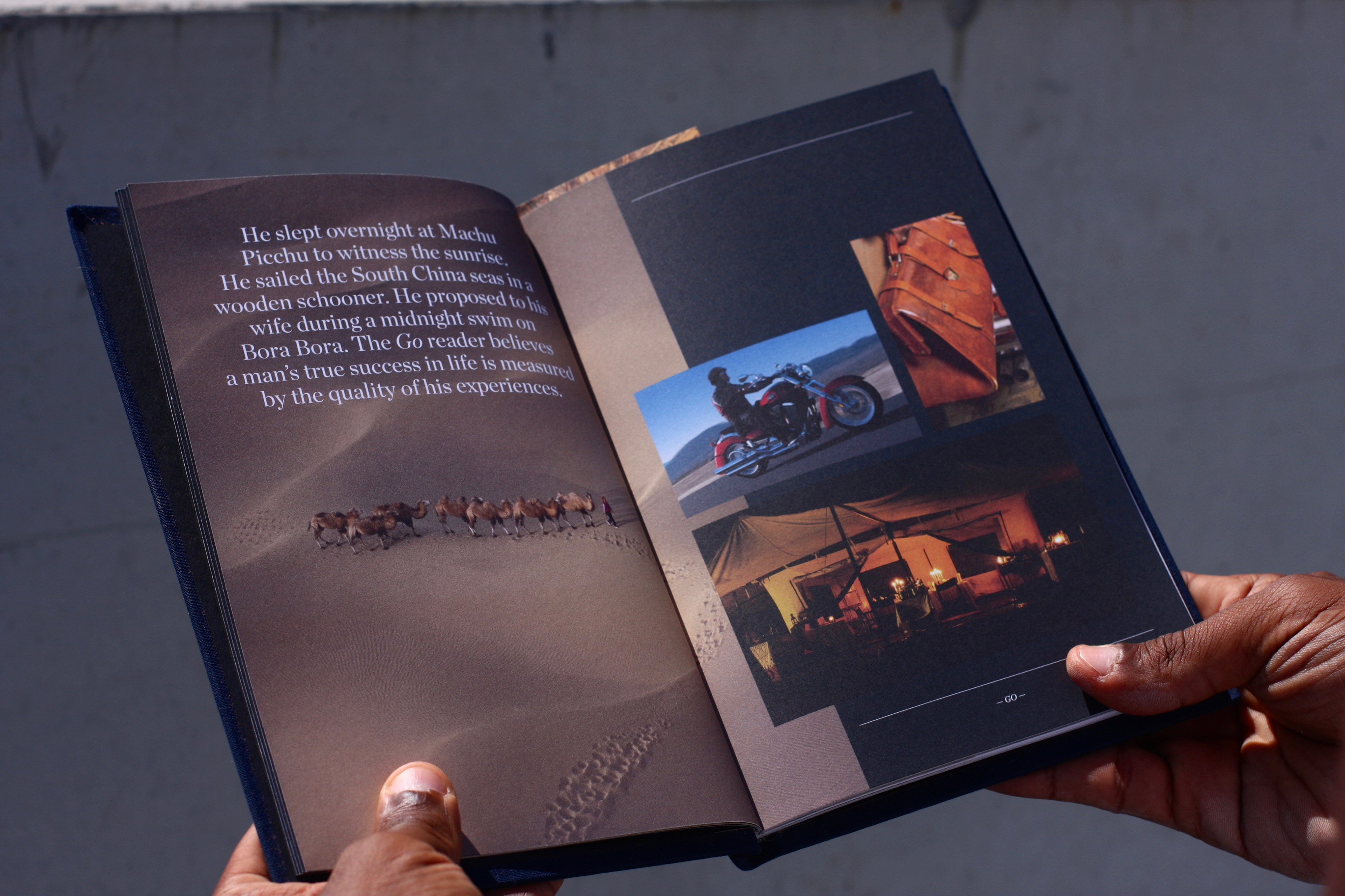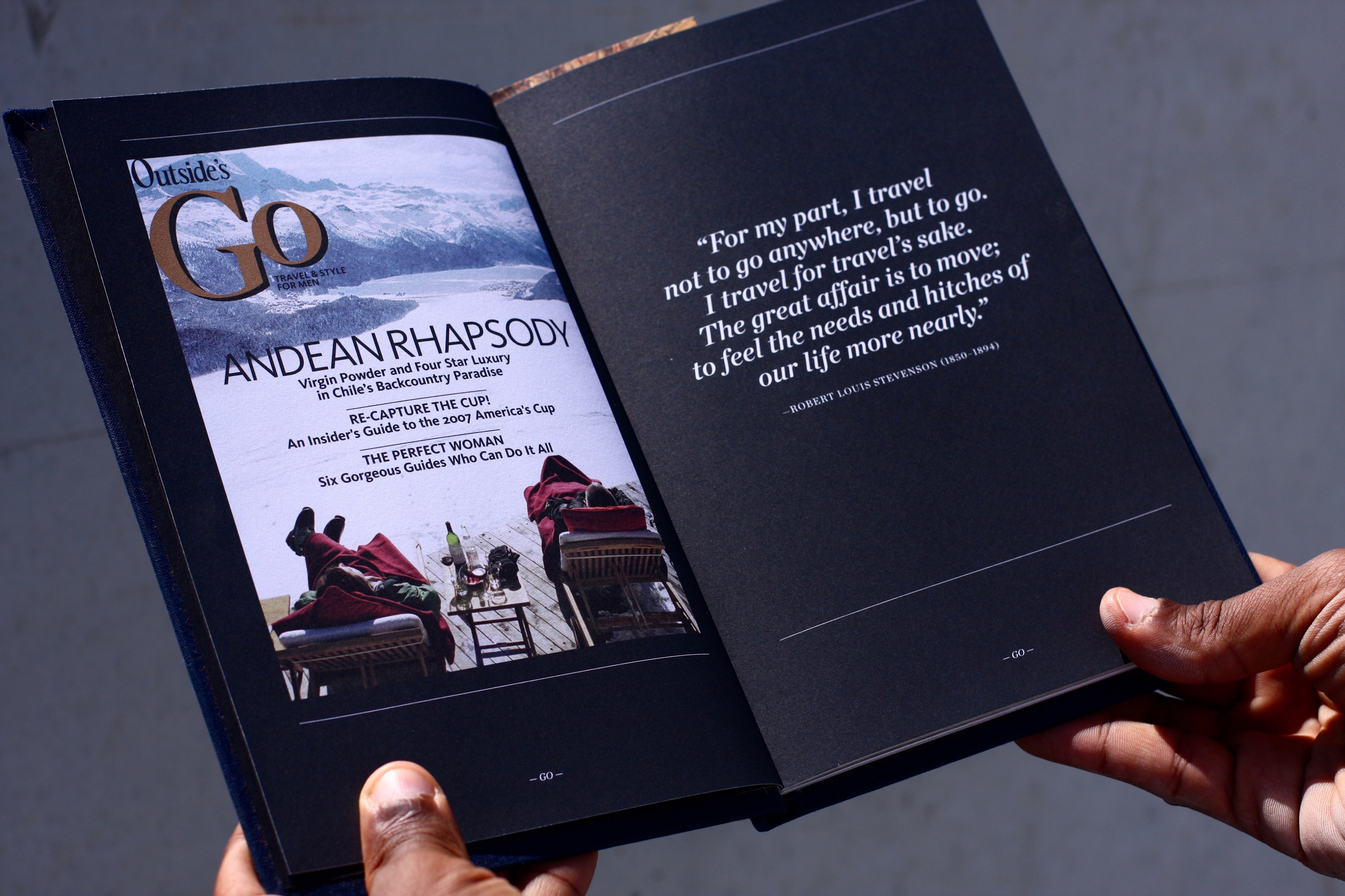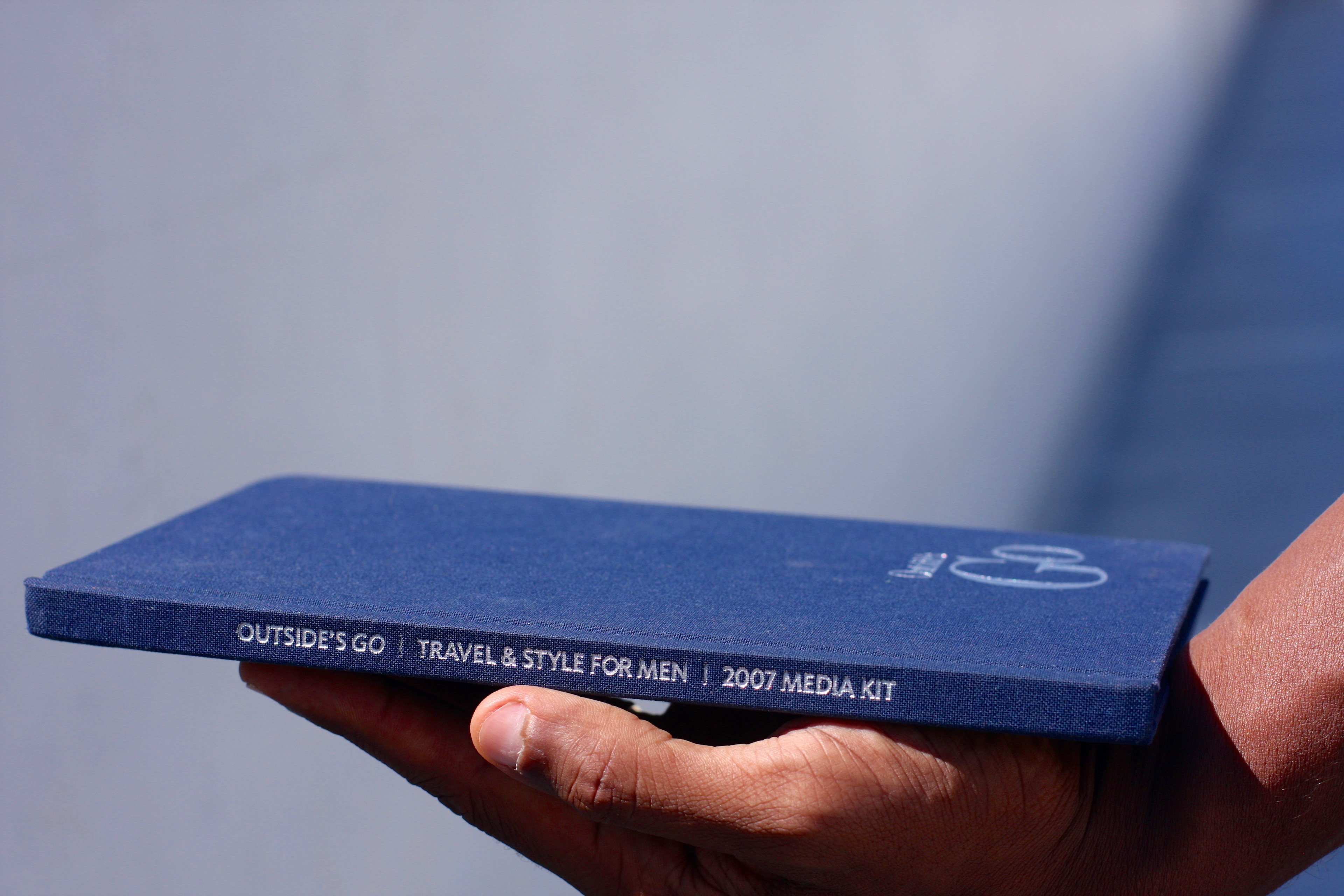 Media kit for Outside magazine as they launch a new men's title, Outside's Go. Hardcover, fabric wrap and silver foil stamp, with special inserts. A collaboration with creative director, Florian Bachleda. Production by Vince Bailey.
